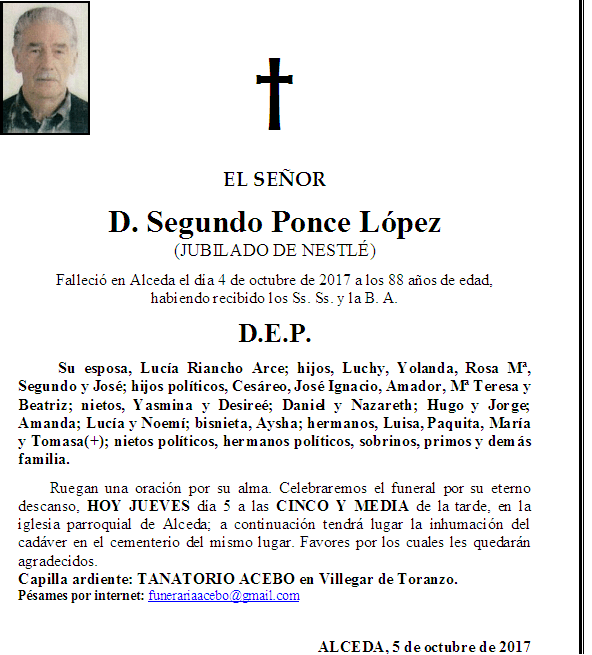 D. Segundo Ponce López en 5 octubre, 2017 por funerariaacebo Comparte esto: Haz clic para compartir en X (Se abre en una ventana nueva) X Haz clic para compartir en Facebook (Se abre en una ventana nueva) Facebook Me gusta Cargando... Relacionado