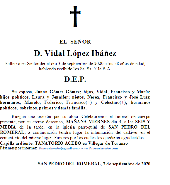 D. Vidal López Ibáñez- San Pedro del Romeral en 3 septiembre, 2020 por funerariaacebo Comparte esto: Haz clic para compartir en X (Se abre en una ventana nueva) X Haz clic para compartir en Facebook (Se abre en una ventana nueva) Facebook Me gusta Cargando... Relacionado