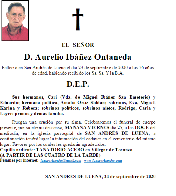 D. Aurelio Ibáñez Ontaneda- San Andrés de Luena en 24 septiembre, 2020 por funerariaacebo Comparte esto: Haz clic para compartir en X (Se abre en una ventana nueva) X Haz clic para compartir en Facebook (Se abre en una ventana nueva) Facebook Me gusta Cargando... Relacionado