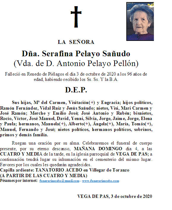 Dña. Serafina Pelayo Sañudo- Vega de Pas en 3 octubre, 2020 por funerariaacebo Comparte esto: Haz clic para compartir en X (Se abre en una ventana nueva) X Haz clic para compartir en Facebook (Se abre en una ventana nueva) Facebook Me gusta Cargando... Relacionado