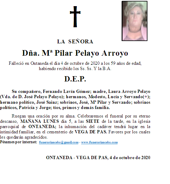 Dña. Mª Pilar Pelayo Arroyo- Ontaneda- Vega de Pas en 4 octubre, 2020 por funerariaacebo Comparte esto: Haz clic para compartir en X (Se abre en una ventana nueva) X Haz clic para compartir en Facebook (Se abre en una ventana nueva) Facebook Me gusta Cargando... Relacionado
