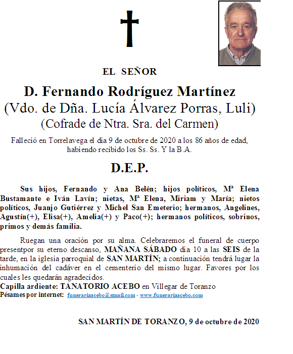 D. Fernando Rodríguez Martínez- San Martín de Toranzo en 9 octubre, 2020 por funerariaacebo Comparte esto: Haz clic para compartir en X (Se abre en una ventana nueva) X Haz clic para compartir en Facebook (Se abre en una ventana nueva) Facebook Me gusta Cargando... Relacionado