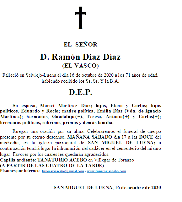 D. Ramón Díaz Díaz- San Miguel de Luena en 16 octubre, 2020 por funerariaacebo Comparte esto: Haz clic para compartir en X (Se abre en una ventana nueva) X Haz clic para compartir en Facebook (Se abre en una ventana nueva) Facebook Me gusta Cargando... Relacionado