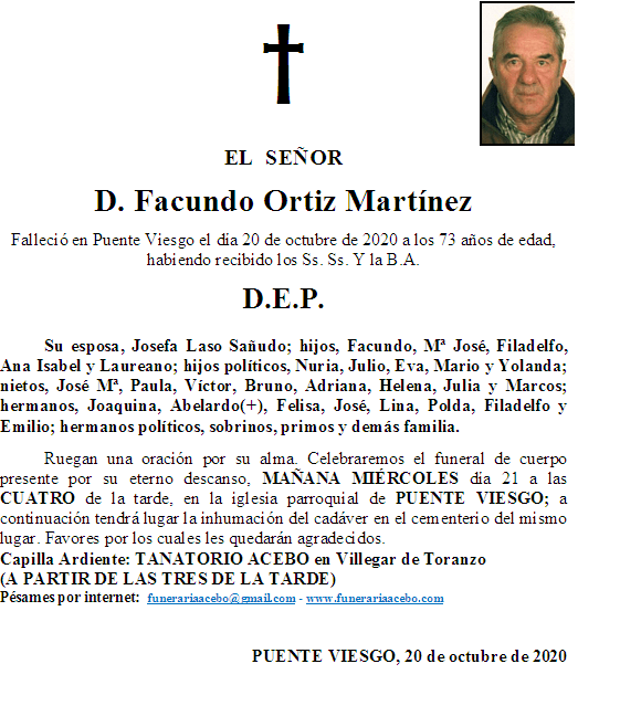 D. Facundo Ortiz Martínez- Puente Viesgo en 20 octubre, 2020 por funerariaacebo Comparte esto: Haz clic para compartir en X (Se abre en una ventana nueva) X Haz clic para compartir en Facebook (Se abre en una ventana nueva) Facebook Me gusta Cargando... Relacionado