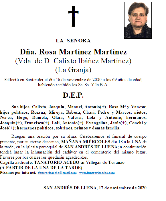 Dña. Rosa Martínez Martínez- San Andrés de Luena en 17 noviembre, 2020 por funerariaacebo Comparte esto: Haz clic para compartir en X (Se abre en una ventana nueva) X Haz clic para compartir en Facebook (Se abre en una ventana nueva) Facebook Me gusta Cargando... Relacionado