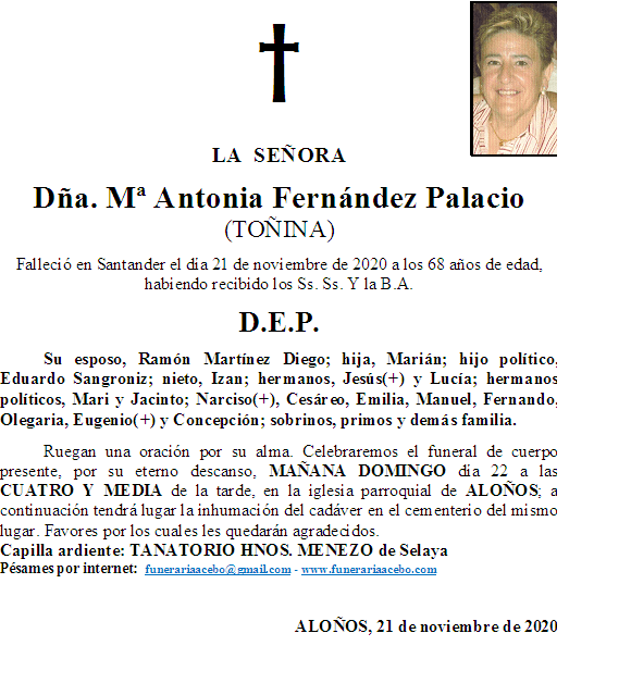 Dña. Mª Antonia Fernández Palacio(Toñina)- Aloños en 21 noviembre, 2020 por funerariaacebo Comparte esto: Haz clic para compartir en X (Se abre en una ventana nueva) X Haz clic para compartir en Facebook (Se abre en una ventana nueva) Facebook Me gusta Cargando... Relacionado