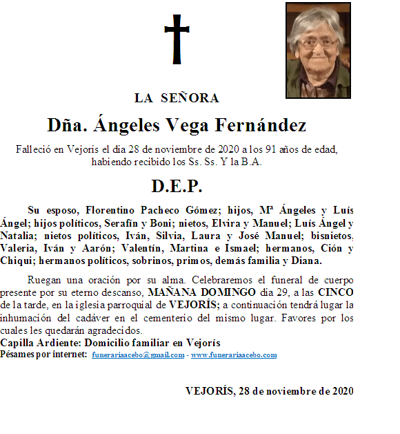 Dña. Ángeles Vega Fernández- Vejorís en 28 noviembre, 2020 por funerariaacebo Comparte esto: Haz clic para compartir en X (Se abre en una ventana nueva) X Haz clic para compartir en Facebook (Se abre en una ventana nueva) Facebook Me gusta Cargando... Relacionado