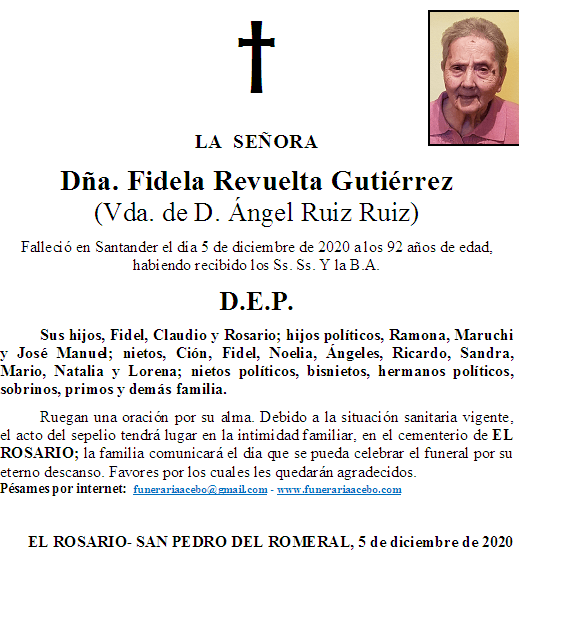 Dña. Fidela Revuelta Gutiérrez- El Rosario- San Pedro del Romeral en 5 diciembre, 2020 por funerariaacebo Comparte esto: Haz clic para compartir en X (Se abre en una ventana nueva) X Haz clic para compartir en Facebook (Se abre en una ventana nueva) Facebook Me gusta Cargando... Relacionado