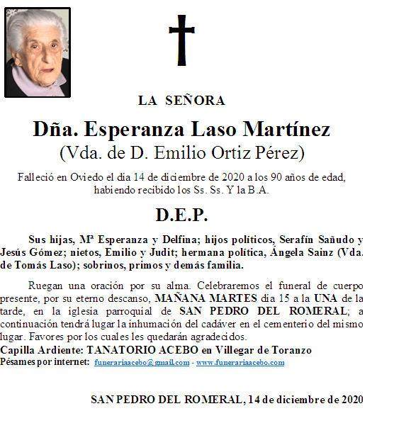 Dña. Esperanza Laso Martínez- San Pedro del Romeral en 14 diciembre, 2020 por funerariaacebo Comparte esto: Haz clic para compartir en X (Se abre en una ventana nueva) X Haz clic para compartir en Facebook (Se abre en una ventana nueva) Facebook Me gusta Cargando... Relacionado