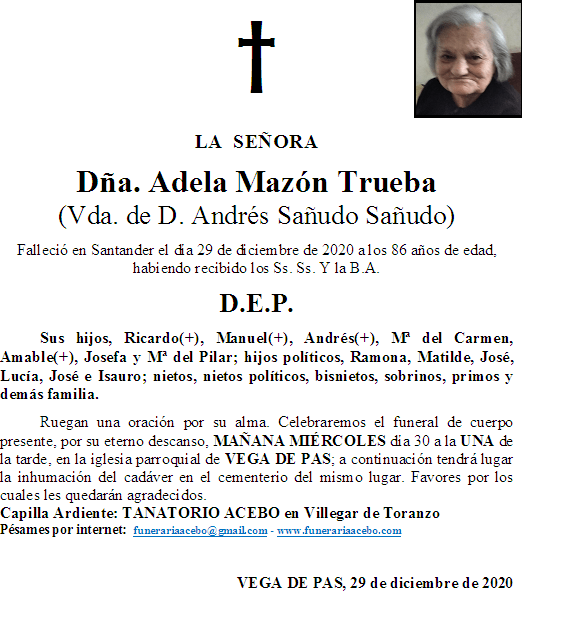 Dña. Adela Mazón Trueba- Vega de Pas en 29 diciembre, 2020 por funerariaacebo Comparte esto: Haz clic para compartir en X (Se abre en una ventana nueva) X Haz clic para compartir en Facebook (Se abre en una ventana nueva) Facebook Me gusta Cargando... Relacionado