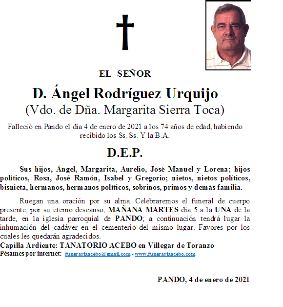 D. Ángel Rodríguez Urquijo- Pando de Toranzo en 4 enero, 2021 por funerariaacebo Comparte esto: Haz clic para compartir en X (Se abre en una ventana nueva) X Haz clic para compartir en Facebook (Se abre en una ventana nueva) Facebook Me gusta Cargando... Relacionado