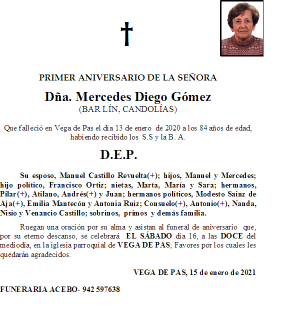 Primer Aniversario- Dña. Mercedes Diego Gómez- Vega de Pas en 12 enero, 2021 por funerariaacebo Comparte esto: Compartir en X (Se abre en una ventana nueva) X Comparte en Facebook (Se abre en una ventana nueva) Facebook Me gusta Cargando... Relacionado
