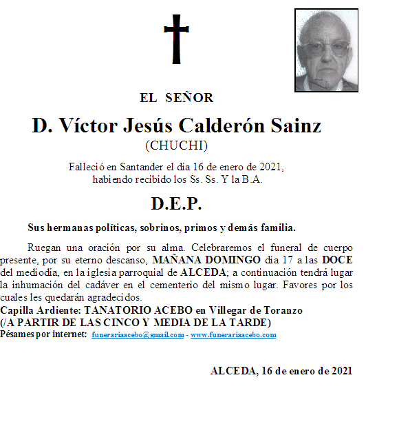 D. Víctor Jesús Calderón Sainz (Chuchi)- Alceda en 16 enero, 2021 por funerariaacebo Comparte esto: Haz clic para compartir en X (Se abre en una ventana nueva) X Haz clic para compartir en Facebook (Se abre en una ventana nueva) Facebook Me gusta Cargando... Relacionado