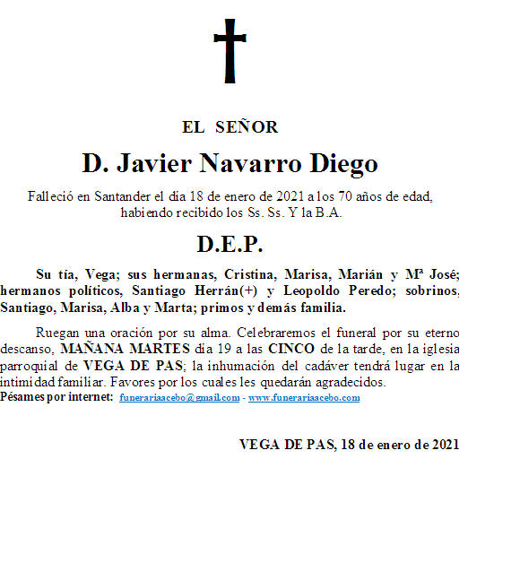 D. Javier Navarro Diego- Vega de Pas en 18 enero, 2021 por funerariaacebo Comparte esto: Haz clic para compartir en X (Se abre en una ventana nueva) X Haz clic para compartir en Facebook (Se abre en una ventana nueva) Facebook Me gusta Cargando... Relacionado
