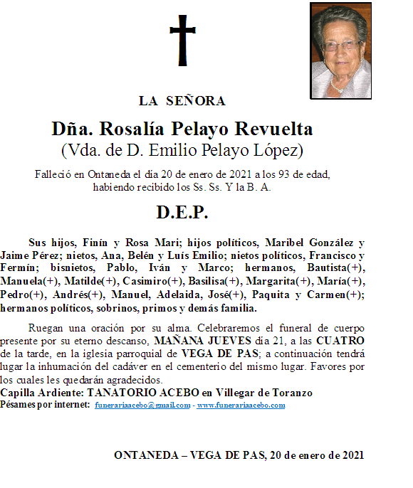 Dña. Rosalía Pelayo Revuelta- Ontaneda- Vega de Pas en 20 enero, 2021 por funerariaacebo Comparte esto: Haz clic para compartir en X (Se abre en una ventana nueva) X Haz clic para compartir en Facebook (Se abre en una ventana nueva) Facebook Me gusta Cargando... Relacionado