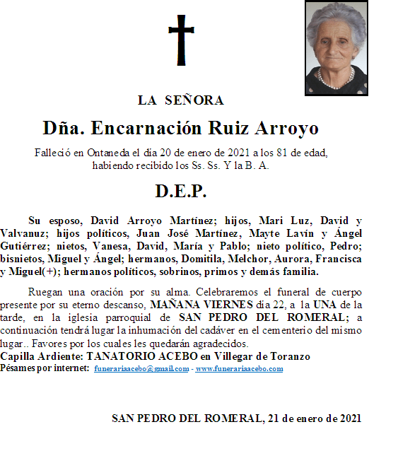 Dña. Encarnación Ruiz Arroyo- San Pedro del Romeral en 21 enero, 2021 por funerariaacebo Comparte esto: Haz clic para compartir en X (Se abre en una ventana nueva) X Haz clic para compartir en Facebook (Se abre en una ventana nueva) Facebook Me gusta Cargando... Relacionado