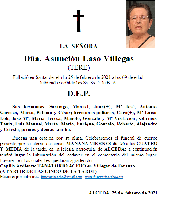 Dña. Asunción Laso Villegas (Tere)- Alceda en 25 febrero, 2021 por funerariaacebo Comparte esto: Haz clic para compartir en X (Se abre en una ventana nueva) X Haz clic para compartir en Facebook (Se abre en una ventana nueva) Facebook Me gusta Cargando... Relacionado