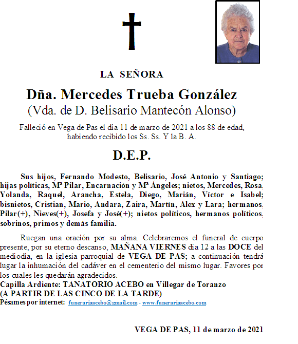 Dña. Mercedes Trueba González- Vega de Pas en 11 marzo, 2021 por funerariaacebo Comparte esto: Haz clic para compartir en X (Se abre en una ventana nueva) X Haz clic para compartir en Facebook (Se abre en una ventana nueva) Facebook Me gusta Cargando... Relacionado