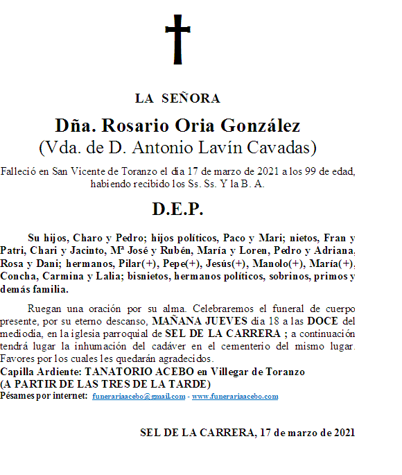 Dña. Rosario Oria González- Sel de la Carrera en 17 marzo, 2021 por funerariaacebo Comparte esto: Haz clic para compartir en X (Se abre en una ventana nueva) X Haz clic para compartir en Facebook (Se abre en una ventana nueva) Facebook Me gusta Cargando... Relacionado