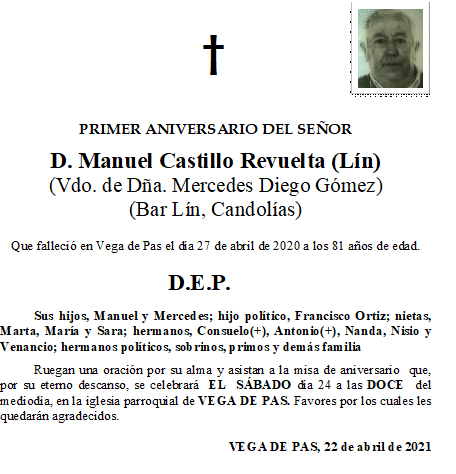 1º Aniversario – D. Manuel Castillo Revuelta (Lín) en 22 abril, 2021 por funerariaacebo Comparte esto: Haz clic para compartir en X (Se abre en una ventana nueva) X Haz clic para compartir en Facebook (Se abre en una ventana nueva) Facebook Me gusta Cargando... Relacionado