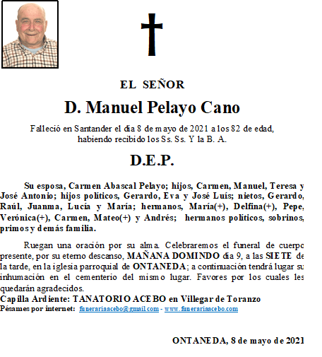 D. Manuel Pelayo Cano- Ontaneda en 8 mayo, 2021 por funerariaacebo Comparte esto: Haz clic para compartir en X (Se abre en una ventana nueva) X Haz clic para compartir en Facebook (Se abre en una ventana nueva) Facebook Me gusta Cargando... Relacionado