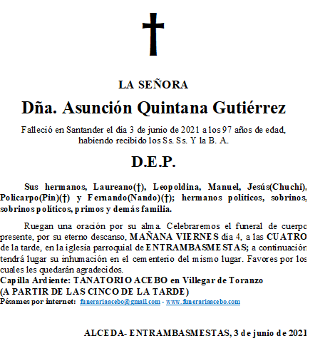 Dña. Asunción Quintana Gutiérrez- Alceda- Entrambasmestas en 3 junio, 20213 junio, 2021 por funerariaacebo Comparte esto: Haz clic para compartir en X (Se abre en una ventana nueva) X Haz clic para compartir en Facebook (Se abre en una ventana nueva) Facebook Me gusta Cargando... Relacionado
