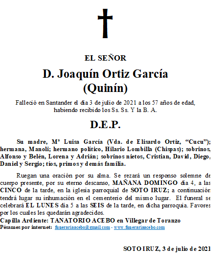 D. Joaquín Ortiz García (Quinín)- Soto Iruz en 3 julio, 2021 por funerariaacebo Comparte esto: Haz clic para compartir en X (Se abre en una ventana nueva) X Haz clic para compartir en Facebook (Se abre en una ventana nueva) Facebook Me gusta Cargando... Relacionado