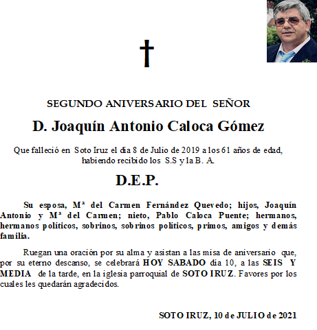 D. Joaquín Antonio Caloca Gómez-(Soto Iruz) Segundo Aniversario. en 9 julio, 2021 por funerariaacebo Comparte esto: Haz clic para compartir en X (Se abre en una ventana nueva) X Haz clic para compartir en Facebook (Se abre en una ventana nueva) Facebook Me gusta Cargando... Relacionado