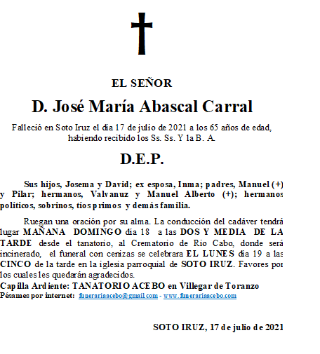 D. José María Abascal Carral – (Soto Iruz) en 17 julio, 2021 por funerariaacebo Comparte esto: Haz clic para compartir en X (Se abre en una ventana nueva) X Haz clic para compartir en Facebook (Se abre en una ventana nueva) Facebook Me gusta Cargando... Relacionado