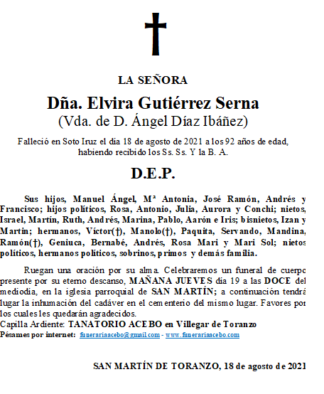 Dña. Elvira Gutiérrez Serna- San Martín de Toranzo en 18 agosto, 2021 por funerariaacebo Comparte esto: Haz clic para compartir en X (Se abre en una ventana nueva) X Haz clic para compartir en Facebook (Se abre en una ventana nueva) Facebook Me gusta Cargando... Relacionado