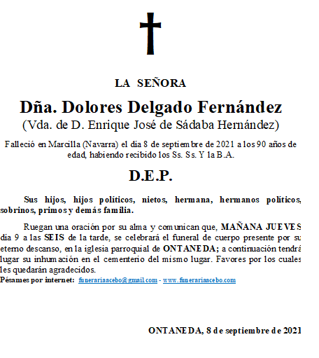 Dña. Dolores Delgado Fernández- Ontaneda en 8 septiembre, 2021 por funerariaacebo Comparte esto: Haz clic para compartir en X (Se abre en una ventana nueva) X Haz clic para compartir en Facebook (Se abre en una ventana nueva) Facebook Me gusta Cargando... Relacionado