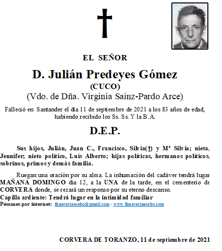 D. Julián Pedreyes Gómez- Corvera de Toranzo en 11 septiembre, 2021 por funerariaacebo Comparte esto: Haz clic para compartir en X (Se abre en una ventana nueva) X Haz clic para compartir en Facebook (Se abre en una ventana nueva) Facebook Me gusta Cargando... Relacionado