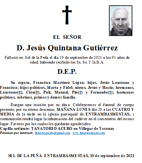 D. Jesús Quintana Gutiérrez- Sel de la Peña- Entrambasmestas en 19 septiembre, 2021 por funerariaacebo Comparte esto: Haz clic para compartir en X (Se abre en una ventana nueva) X Haz clic para compartir en Facebook (Se abre en una ventana nueva) Facebook Me gusta Cargando... Relacionado
