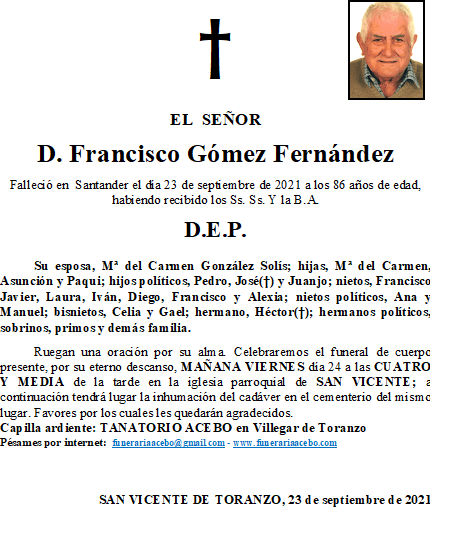 D. Francisco Gómez Fernández- San Vicente de Toranzo en 23 septiembre, 2021 por funerariaacebo Comparte esto: Haz clic para compartir en X (Se abre en una ventana nueva) X Haz clic para compartir en Facebook (Se abre en una ventana nueva) Facebook Me gusta Cargando... Relacionado