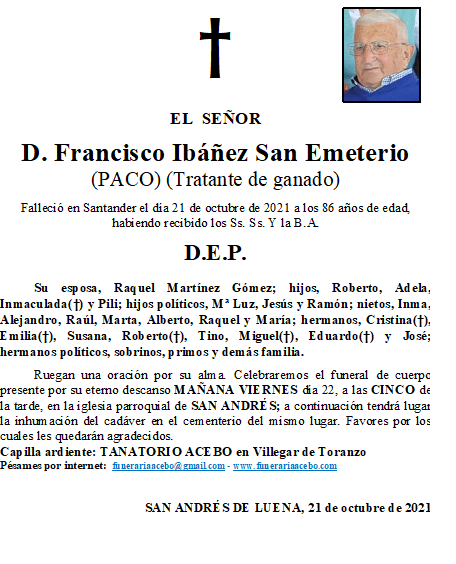 D. Francisco Ibáñez San Emeterio- San Andrés de Luena en 21 octubre, 2021 por funerariaacebo Comparte esto: Haz clic para compartir en X (Se abre en una ventana nueva) X Haz clic para compartir en Facebook (Se abre en una ventana nueva) Facebook Me gusta Cargando... Relacionado