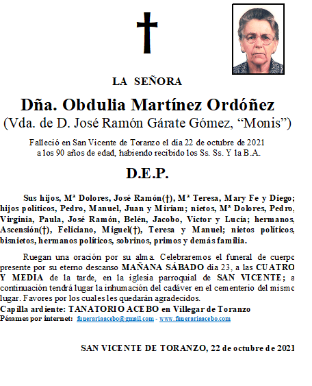 Dña. Obdulia Martínez Ordóñez- San Vicente de Toranzo en 22 octubre, 2021 por funerariaacebo Comparte esto: Haz clic para compartir en X (Se abre en una ventana nueva) X Haz clic para compartir en Facebook (Se abre en una ventana nueva) Facebook Me gusta Cargando... Relacionado