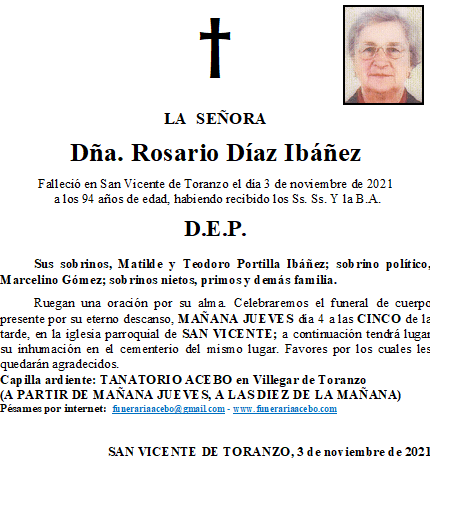 Dña. Rosario Díaz Ibáñez- San Vicente de Toranzo en 3 noviembre, 2021 por funerariaacebo Comparte esto: Haz clic para compartir en X (Se abre en una ventana nueva) X Haz clic para compartir en Facebook (Se abre en una ventana nueva) Facebook Me gusta Cargando... Relacionado