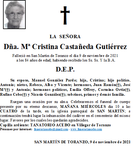 Dña. Mª Cristina Castañeda Gutiérrez- San Martín de Toranzo en 9 noviembre, 2021 por funerariaacebo Comparte esto: Haz clic para compartir en X (Se abre en una ventana nueva) X Haz clic para compartir en Facebook (Se abre en una ventana nueva) Facebook Me gusta Cargando... Relacionado