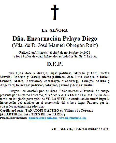 Dña. Encarnación Pelayo Diego- Villasevil en 10 noviembre, 2021 por funerariaacebo Comparte esto: Haz clic para compartir en X (Se abre en una ventana nueva) X Haz clic para compartir en Facebook (Se abre en una ventana nueva) Facebook Me gusta Cargando... Relacionado
