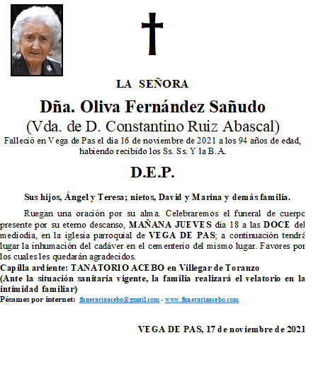 Dña. Oliva Fernández Sañudo- Vega de Pas en 17 noviembre, 2021 por funerariaacebo Comparte esto: Haz clic para compartir en X (Se abre en una ventana nueva) X Haz clic para compartir en Facebook (Se abre en una ventana nueva) Facebook Me gusta Cargando... Relacionado