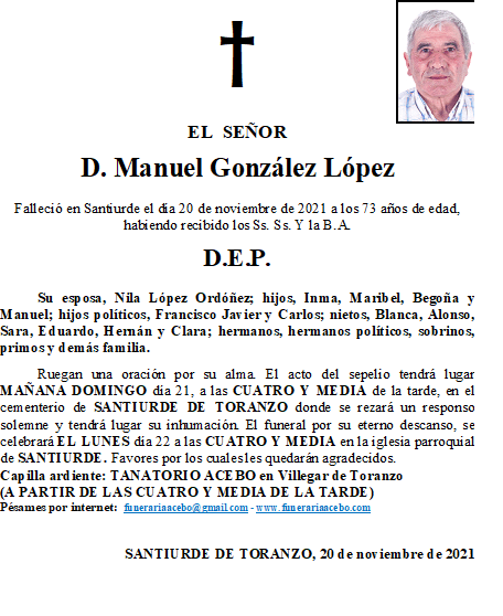 D. Manuel González López- Santiurde de Toranzo en 20 noviembre, 2021 por funerariaacebo Comparte esto: Haz clic para compartir en X (Se abre en una ventana nueva) X Haz clic para compartir en Facebook (Se abre en una ventana nueva) Facebook Me gusta Cargando... Relacionado