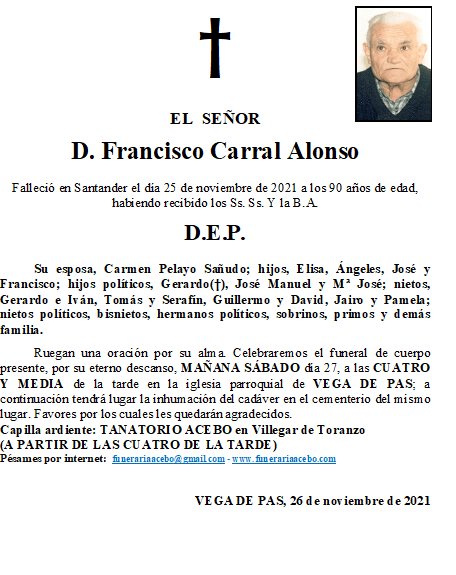 D. Francisco Carral Alonso- Vega de Pas en 26 noviembre, 2021 por funerariaacebo Comparte esto: Haz clic para compartir en X (Se abre en una ventana nueva) X Haz clic para compartir en Facebook (Se abre en una ventana nueva) Facebook Me gusta Cargando... Relacionado