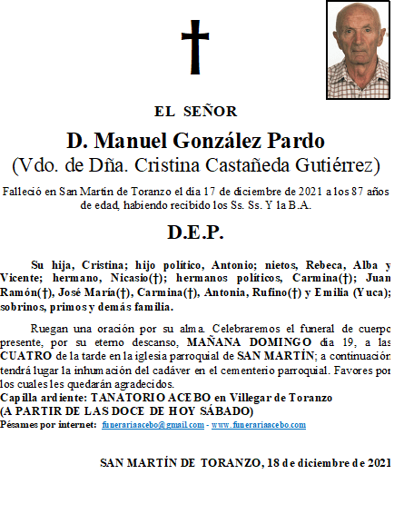 D. Manuel González Pardo- San Martín de Toranzo en 18 diciembre, 2021 por funerariaacebo Comparte esto: Haz clic para compartir en X (Se abre en una ventana nueva) X Haz clic para compartir en Facebook (Se abre en una ventana nueva) Facebook Me gusta Cargando... Relacionado
