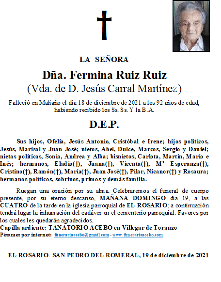Dña. Fermina Ruiz Ruiz – El Rosario (San Pedro del Romeral) en 18 diciembre, 2021 por funerariaacebo Comparte esto: Haz clic para compartir en X (Se abre en una ventana nueva) X Haz clic para compartir en Facebook (Se abre en una ventana nueva) Facebook Me gusta Cargando... Relacionado
