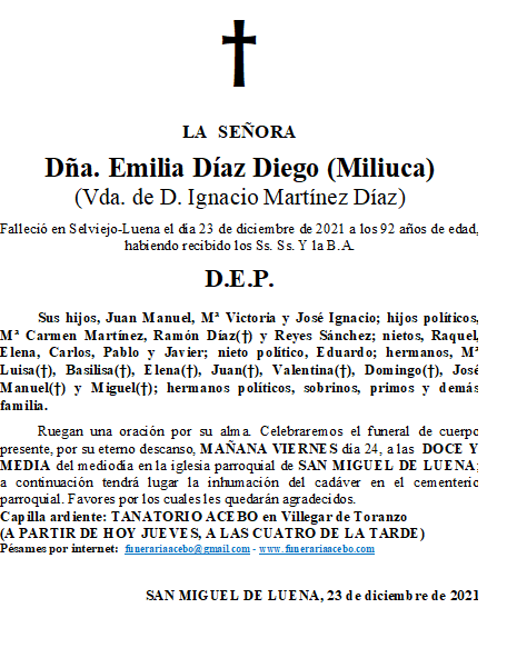 Dña. Emilia Díaz Diego (Miliuca)- San Miguel de Luena en 23 diciembre, 2021 por funerariaacebo Comparte esto: Haz clic para compartir en X (Se abre en una ventana nueva) X Haz clic para compartir en Facebook (Se abre en una ventana nueva) Facebook Me gusta Cargando... Relacionado