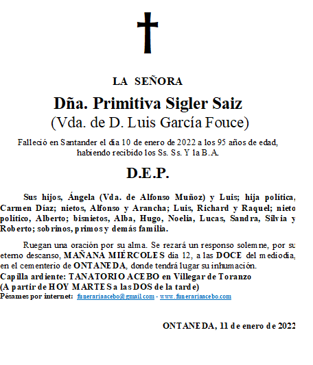 Dña. Primitiva Sigler Saiz- Ontaneda en 11 enero, 2022 por funerariaacebo Comparte esto: Haz clic para compartir en X (Se abre en una ventana nueva) X Haz clic para compartir en Facebook (Se abre en una ventana nueva) Facebook Me gusta Cargando... Relacionado