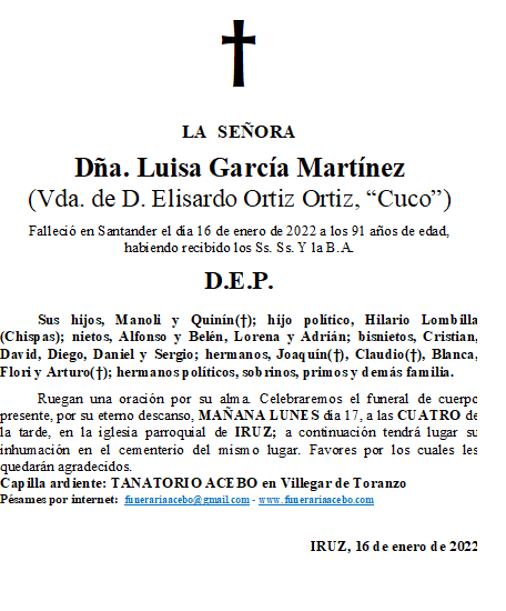 Dña. Luisa García Martínez- Iruz en 16 enero, 2022 por funerariaacebo Comparte esto: Haz clic para compartir en X (Se abre en una ventana nueva) X Haz clic para compartir en Facebook (Se abre en una ventana nueva) Facebook Me gusta Cargando... Relacionado