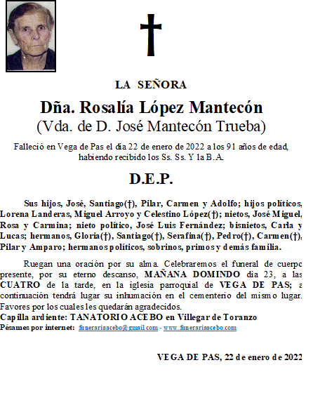 Dña. Rosalía López Mantecón- Vega de Pas en 22 enero, 2022 por funerariaacebo Comparte esto: Haz clic para compartir en X (Se abre en una ventana nueva) X Haz clic para compartir en Facebook (Se abre en una ventana nueva) Facebook Me gusta Cargando... Relacionado