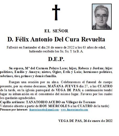D. Félix Antonio Del Cura Revuelta- Vega de Pas en 26 enero, 2022 por funerariaacebo Comparte esto: Haz clic para compartir en X (Se abre en una ventana nueva) X Haz clic para compartir en Facebook (Se abre en una ventana nueva) Facebook Me gusta Cargando... Relacionado