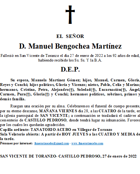 D. Manuel Bengochea Martínez- San Vicente de Toranzo- Castillo Pedroso en 27 enero, 2022 por funerariaacebo Comparte esto: Haz clic para compartir en X (Se abre en una ventana nueva) X Haz clic para compartir en Facebook (Se abre en una ventana nueva) Facebook Me gusta Cargando... Relacionado